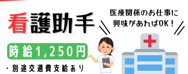 看護助手(お仕事 ID:T056-1) 【募集要項】 ★仕事内容 一般病棟での看護助手業務 ・看護師補助作業 ・シーツ交換や整理、清掃など ・食事介助 ※ローテーション勤務が出来る方! ★給与 【時給】1,250円 ★勤務時間 勤務形態:シフト制 6:45…