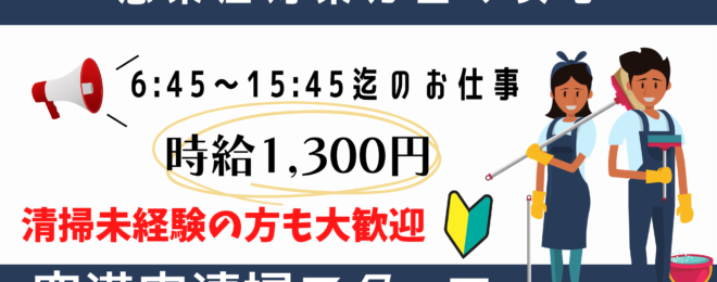 成田空港内清掃スタッフ(お仕事 ID:K097-1) 【募集要項】 ★仕事内容 成田空港ターミナル内での清掃作業 ・成田空港内のロビー ・事務室等 ・化粧室 ★給与 【時給】1,300円 ★勤務時間 勤務形態:シフト制 06:45~15:45(休憩90分…
