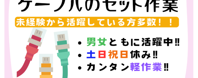 ケーブルのセット作業(お仕事 ID:K255) 【募集要項】 ★仕事内容 ◆工場内作業 定位置にケーブルをセット ↓ お客様ご指定のケーブルの長さに合わせて プラグを取り付ける ★給与 【時給】1,200円 ★勤務時間 8:00~17:00(※実働8H) …