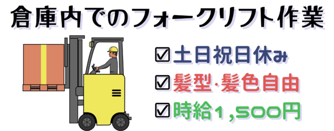 工場内でのフォークリフトスタッフ(お仕事 ID:T047-4) 【募集要項】 ★仕事内容 工場内での作業(フォークリフト使用) ・資材の受入・調達 ・工場内への調達 ・商品の移動等 ★給与 【時給】1,280円 ★勤務時間 8:00~17:00(休憩60分) …