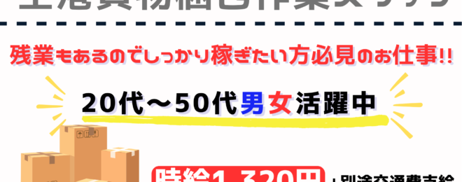 (お仕事 ID:T070-2)空港貨物の梱包作業 【募集要項】 ★仕事内容 倉庫内作業 *空港貨物の梱包作業 *ラッピング作業 ・梱包された商品を パレットに積み、ラップで固定 ★給与 【時給】1,320円 ★勤務時間 ・9:00~18:00 ※休憩60分 …