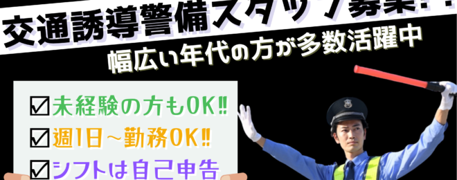 交通警備スタッフ 【募集要項】 ★仕事内容 千葉県内の交通誘導のお仕事です。 主に成田市、旭市、山武市、横芝光町などでの就労 日々景観が変わるので、 街や自然の景色を楽しみながらお仕事することができますよ♪ 【具体的には】 ・車の誘導:工事現場や駐車場で車を安全に…